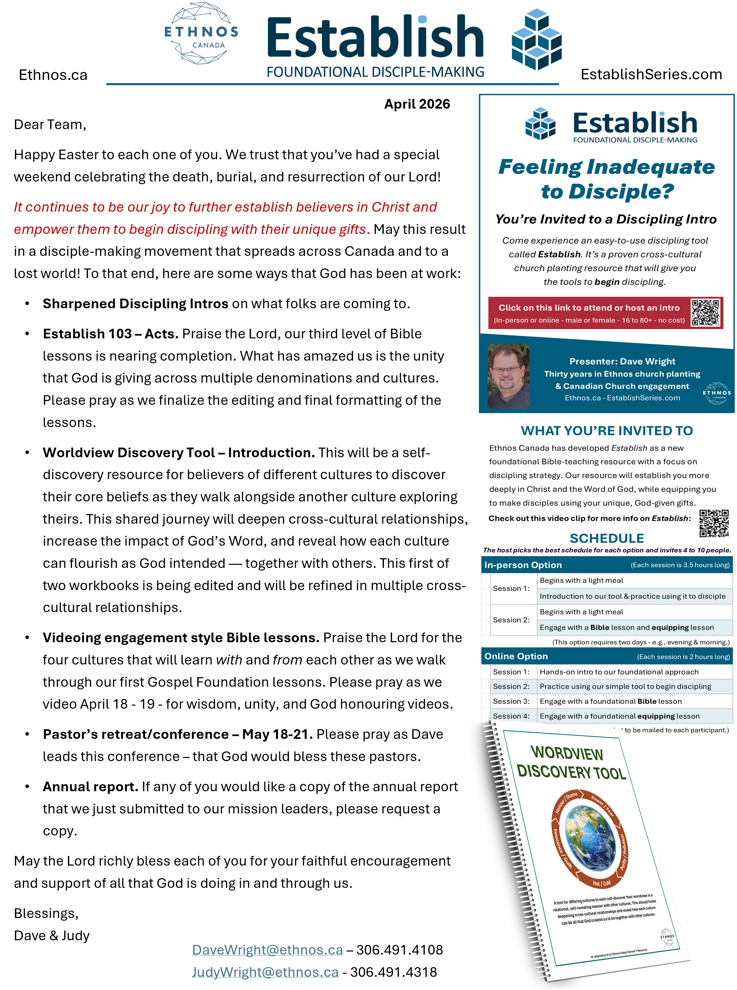 I’m having some issues in sending out our most recent ministry update, so I’m forwarding this to you as one of our supporting churches. As well, I’m including an annual update that I had to submit to our Ethnos Canada leadership team. Please forward these notes to your missions team and anyone else that you need to. If there are any questions, I’d love to meet with you to discuss them.